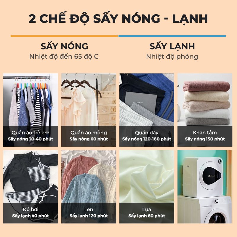 Máy sấy quần áo 2GOOD GB10 có 2 Chế độ Sấy Nóng - Lạnh riêng biệt: Sấy nóng đến 65 độ C, giúp quần áo khô ráo chỉ từ 1-2 giờ. Sấy lạnh giúp bảo vệ quần áo từ các chất liệu cao cấp như vải lụa, vải len, đồ bơi,...