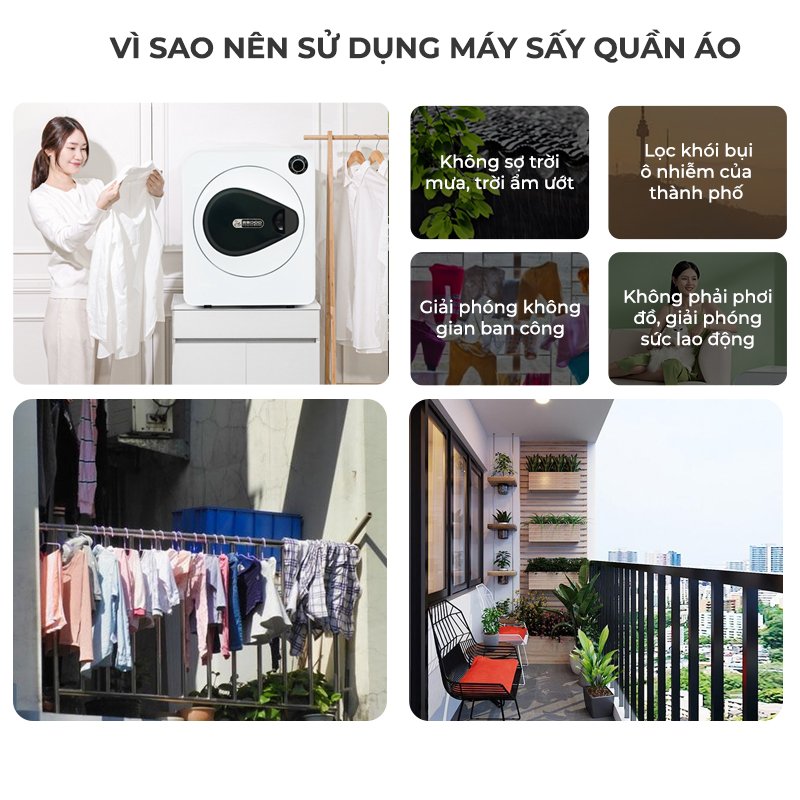 Giải phóng không gian ban công. Loại bỏ hoàn toàn nhu cầu phơi quần áo, giúp khách hàng tiết kiệm công sức, thời gian, nâng cao chất lượng cuộc sống và không gian sinh hoạt